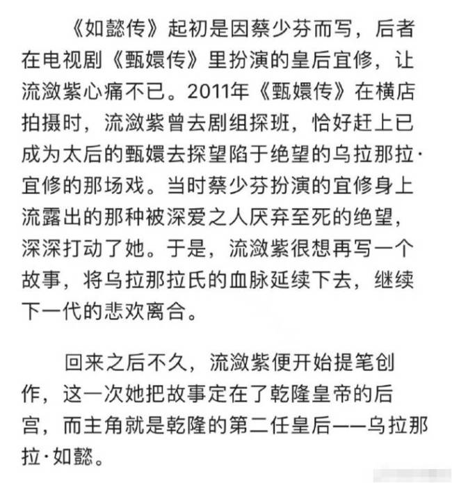近日,有网友发现《甄嬛传》原著作者流潋紫曾在采访中表示,她去探班《甄嬛传》剧组时,恰好赶上成为太后的甄嬛去探望陷于绝望的乌拉那拉·宜修那场戏,被蔡少芬扮演的宜修深深打动,于是流潋紫很想再写一个故事,将乌拉那拉氏的血脉延续下去,回来后不久,开始提笔创作《如懿传》。