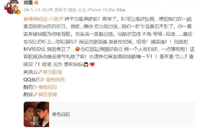 刘维发歌纪念妈妈:“想你但也没办法…我们一时半会是见不到了,你一直说希望我能为你唱首歌,其实我一直都在想,但是总觉得不急等等…结果……最后也没让你听上…”