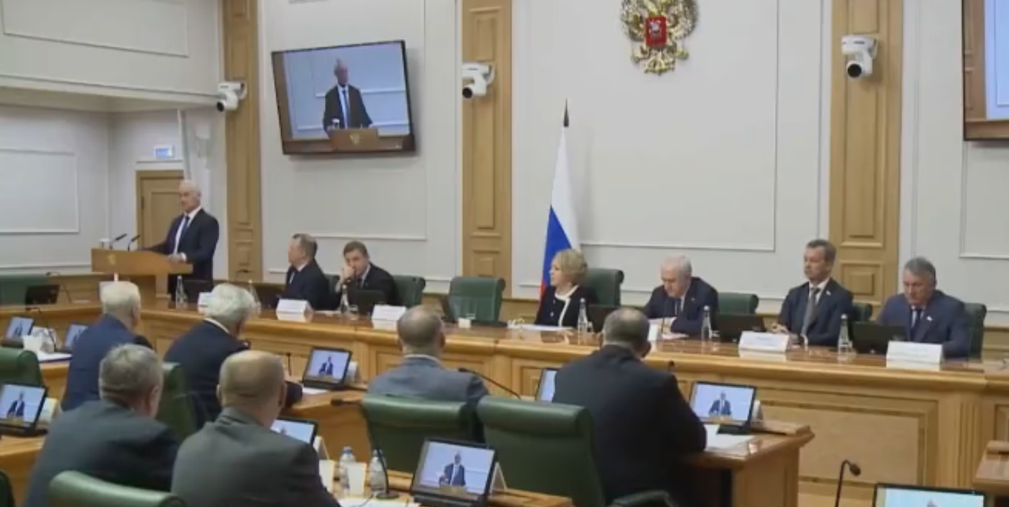 别洛乌索夫在俄联邦委员会上发言,委员会正就他的防长候选人资格举行磋商。 视频截图