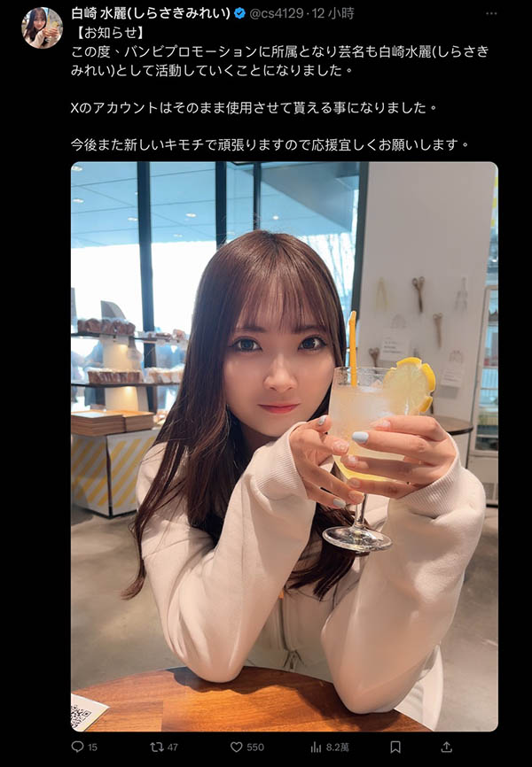 她是谁?她是白崎水丽,她在X(https://twitter.com/cs4129)的发文说了,从今天开始,她就是事务所Bambi Promotion的「白崎水丽」,今后请大家多多指教〜