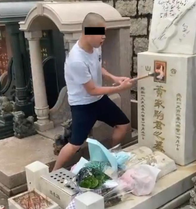 乐队Beyond主音黄家驹1993年离世后,安葬于将军澳华人永远坟场,今早11时多,其墓碑竟遭一名自称“社会破坏者光头Bob”的男子疯狂破坏,该男子一边唱《海阔天空》,一边向墓碑淋汽水、涂污墓碑,又用铁锤重击碑上照片等,行为简直人神共愤。目前警方已拘捕涉案男子,而墓碑暂时以白布围封。