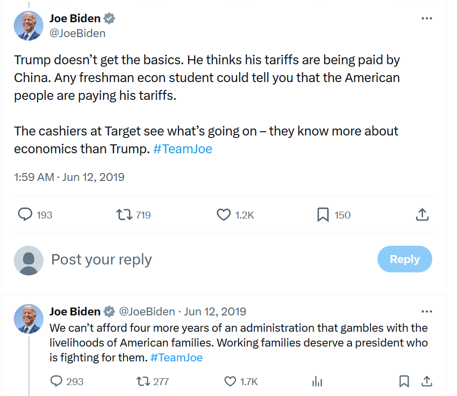 几年前拜登反对特朗普对中国打贸易战的时候,还知道嘲讽:“任何一个经济学新生都会告诉你美国人民在为他的关税付费,而不是中国”