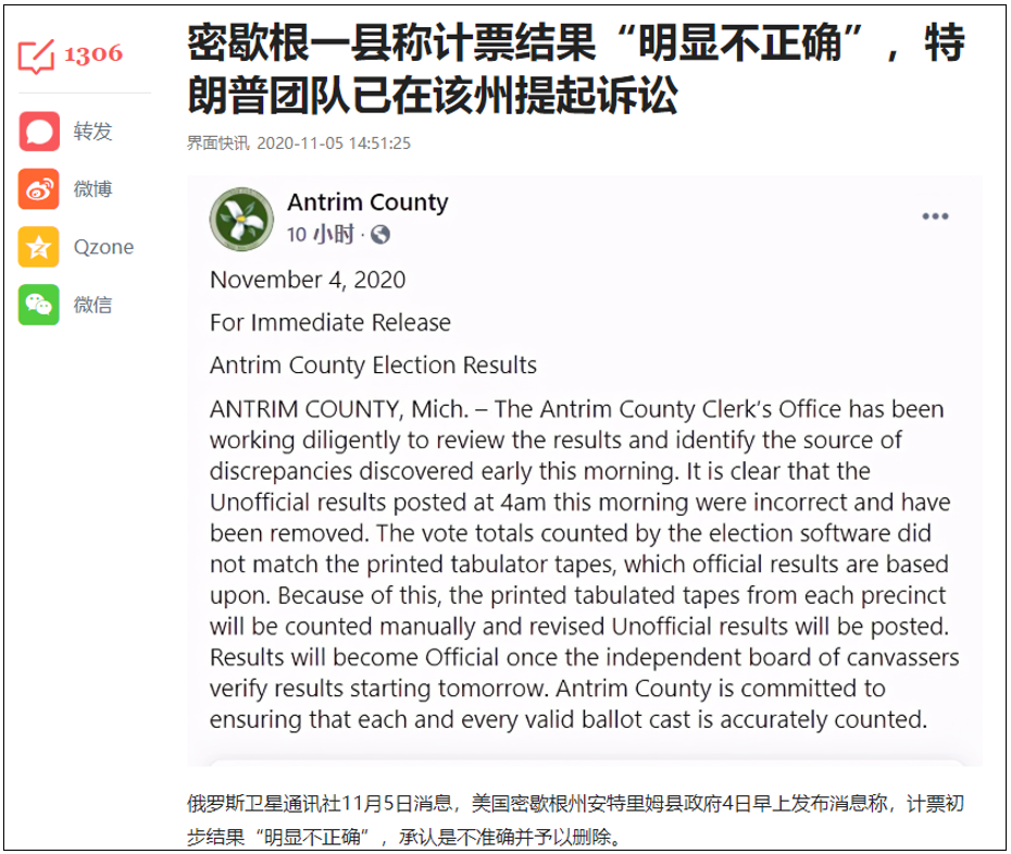 展到最坏的这一步,本来只是备着的,根本就没有想到会用到它们,但是偏偏就用到了,而且还不得不在短时间内大批量的抛出去,否则根本无法逆转形势。俄罗斯卫星通讯社11月5日消息,美国密歇根州安特里姆县政府4日早上发布消息称:“今天凌晨,安特里姆县选举委员会主席谢里尔∙盖伊获悉在非正式统计投票结果时存在明显失真的结果。从那时起,选举委员会主席办公室一直在核查结果。”