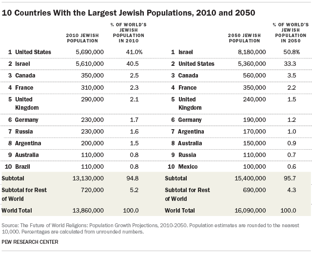 (图:2010年全球犹太人口数量最多的十个国家,以及对2050年犹太人口的估计)