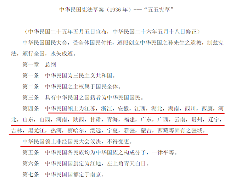 在1936年的《中华民国宪法草案》的第四条就明确写道“中华民国领土为江苏、浙江、安徽、江西、湖北、湖南、四川、西康、河北、山东、山西、河南、陕西、甘肃、青海、福建、广东、广西、云南、贵州、辽宁、吉林、黑龙江、热河、察哈尔、绥远、宁夏、新疆、蒙古、 ... 等固有之疆域。”