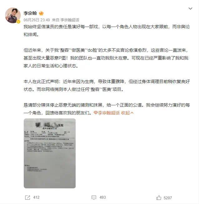 日前,有网友在社交平台晒出偶遇李宗翰的视频,视频中,李宗翰的状态引发热议。有网友质疑其做医美、整容。6月26日晚,李宗翰发文回应,称近年来因为生病,导致体重骤降,但经过身体调理目前稍恢复良好状态。而非网络揣测做过“整容”“医美”项目。