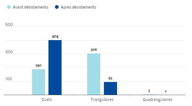超过210人宣布退选后,三方对决的选区降至95个,两方对决升至404个(世界报)