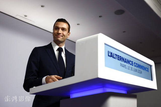 当地时间6月30日,法国国民议会选举第一轮投票结束,“国民联盟”主席巴尔德拉发表讲话。(澎湃影像)