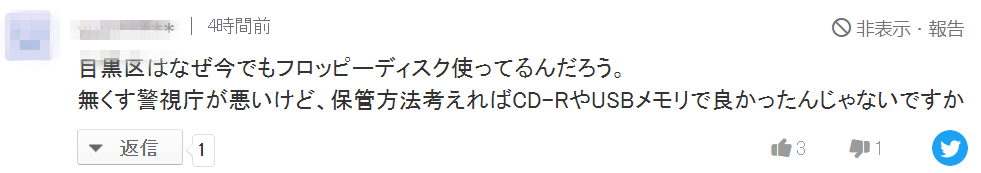“目黑区为什么到现在还在用软盘?虽然警方丢东西不好,但是存储方式还是CD-R和USB存储器比较好吧。”