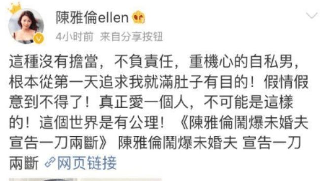 当时她愤怒的发文:这种没有担当,不负责任,重机心的自私男根本从第一天追求我,就满肚子有目的!假情假意到不得了!真正爱一个人,不可能是这样的!这个世界是有公理!