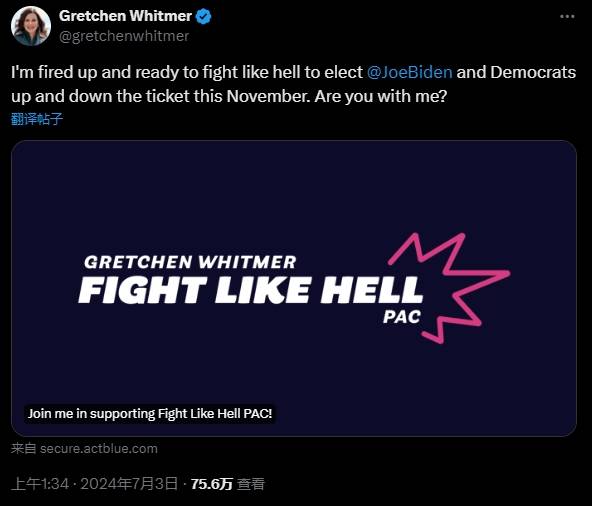 惠特默是拜登连任竞选活动的联合主席,一直在社交媒体上发布她对拜登的支持。7月3日,她在X平台写道:“我斗志昂扬,准备拼尽全力在11月为拜登和民主党的选举而战。你和我一样吗?”但仔细一看,她附上链接,将捐款直接导向她自己的政治行动委员会,而不是拜登的竞选活动。