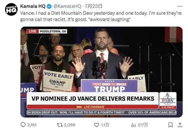 在吐槽民主党会给任何事都扣上“种族主义”的帽子时,他说道:“我昨天喝了一杯无糖‘激浪’汽水(Diet Mountain Dew),今天又喝了一杯,我肯定他们也会说这是种族主义。”现场只响起了零星的笑声,万斯自己笑得前仰后合,还不忘给自己挽尊,“在前排讲笑话,你们(观众)可能听不到。”