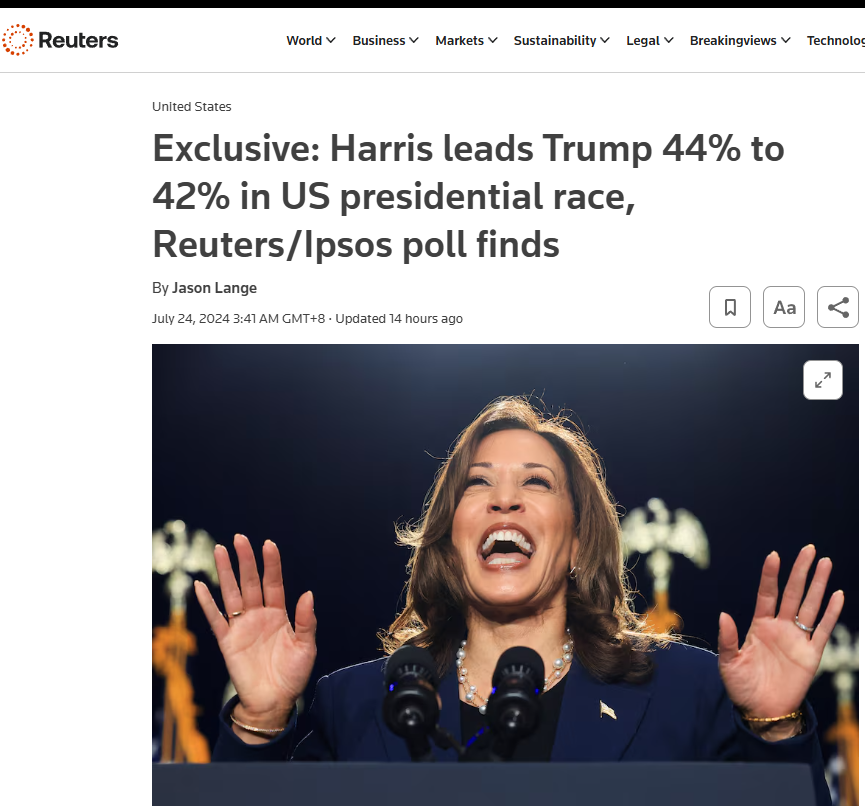 路透社压根就不会给任何数据,大多数人看了这份新闻就:没想到哈里斯还这么受欢迎呢。