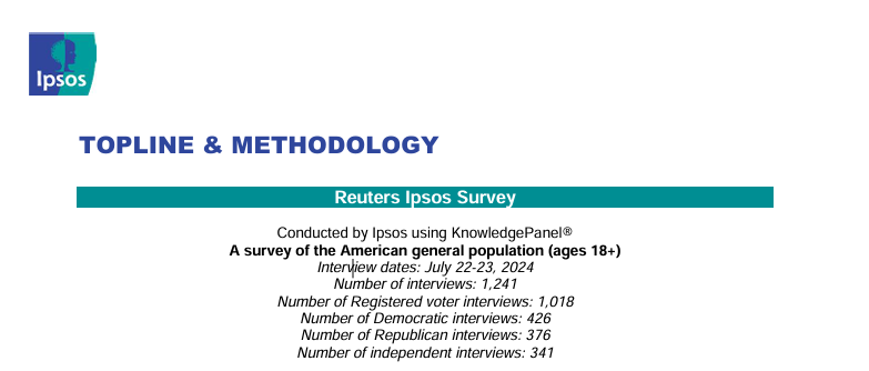 说起阴谋论,今天主流媒体又搞了一个事,哈里斯的民调超过拜登,这次可不是什么“右翼阴谋论”,这个是“主流媒体”,路透社与益索普搞出来的民调: