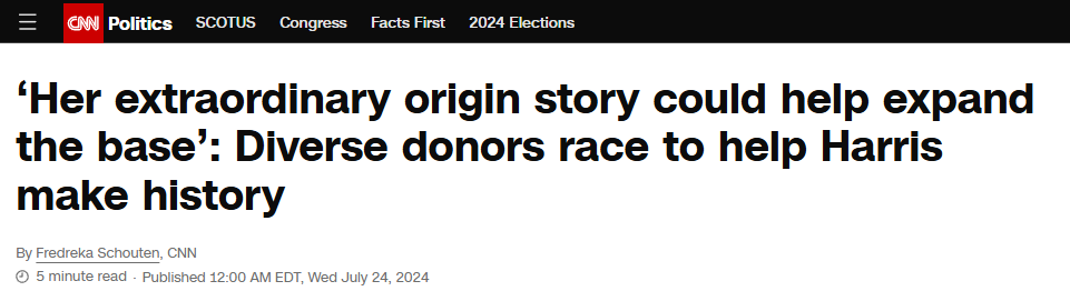 第一,CNN认为,哈里斯获得的捐助比较多元化,这归功于她是一个“印度裔,亚裔,黑人,女性”,她身上的BUFF比较多。