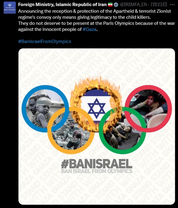 伊朗外交部呼吁抵制以色列运动员参加奥运会 推文截图
