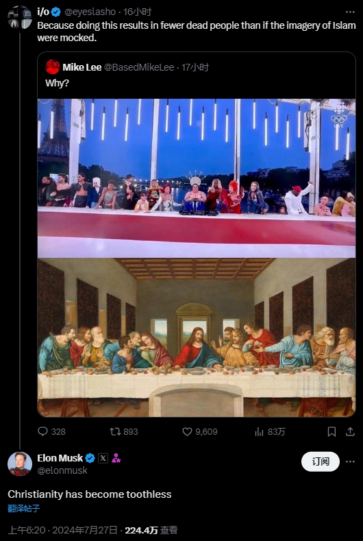 “这是对基督教徒的极度不尊重,”马斯克同日在评价相关表演片段时,再次表示。