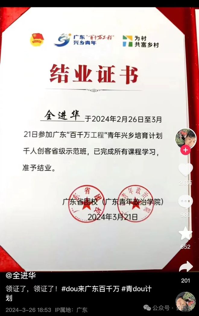 之后还看到全进华参加了省团校2024年广东“百千万工程”青年兴乡培育计划千人创客省级示范班,学完示范班的所有课程,顺利结业。