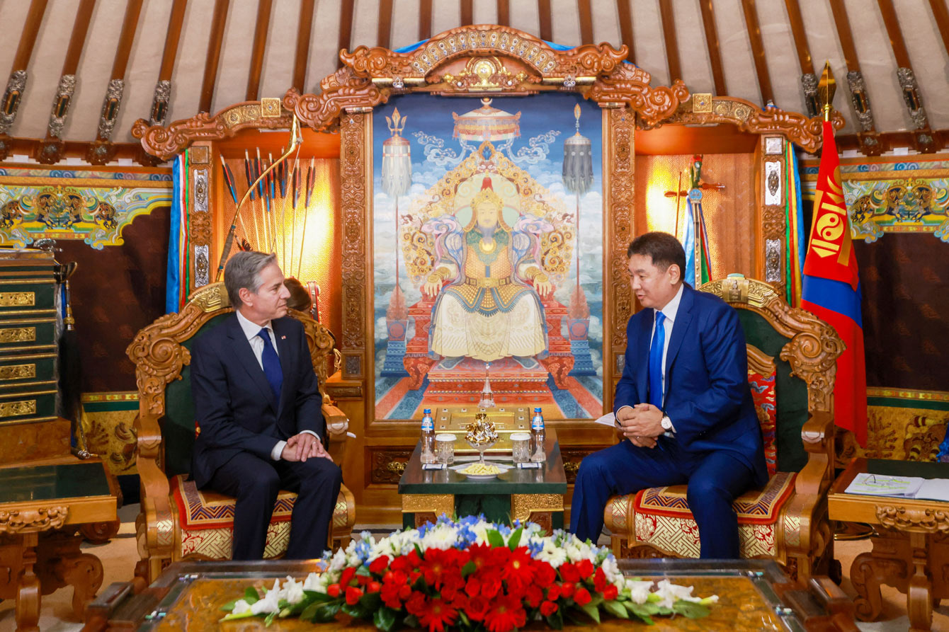 2024年8月1日,蒙古国乌兰巴托,蒙古国总统呼日勒苏赫会见美国国务卿布林肯。澎湃影像