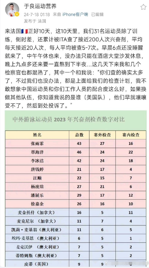 对于这个提问,奥委会发言人的回答是中国游泳队是巴黎奥运会上接受兴奋剂检测最多的队伍,今年以来已经接受了600多次兴奋剂检测,直接把这种恶意提问怼了回去。这个记者的提问不仅非常恶意而且非常奇怪,什么叫100米自由泳的记录是不可能被打破的?大家参加奥运会不就是为了打破奥运会记录吗,如果奥运记录不可能被打破那我们还参加奥运会干嘛。白人无法打破100米自由泳的奥运记录就等价于人类不可能打破,这位记者就算想抹黑中国队的成绩也不至于说拿出如此自大的说辞吧。一般情况下昂撒人是输得起的,虽然输了也会叽叽歪歪但都是认账的,没有奥运精神的是代表是韩国而不是昂撒国家。但游泳领域的奥运记录被中国人刷新,还是超高成绩破了奥运记录,这个昂撒人真的认为是不可能,他们的第一反应就是潘展乐绝对是吃了一种超强的兴奋剂,之所以没有被检查出来那是因为这种兴奋剂刚被人类研发出来,目前地球上还没人知道。这种想法在中国人看起来是莫名其妙,但在昂撒国家看起来却是理所当然。以美国队为例,这次美国游泳队全体成员在比赛完之后都变成了“紫薯精”,整个脸都呈现一种很不正常的紫色。不是某一个美国游泳队员脸部深紫色,而是所有美国游泳队员都脸部呈现紫薯颜色,不止是队里的白种人脸部颜色异常,就连队里的黄种人脸部颜色也异常。而在美国队之外,不管是哪个国家的白种人和黄种人,在同一个泳池里,脸色都是正常的,就连欧洲队都是正常的。而这些美国队的同一个成员,在去年以及前年的国际比赛中,游泳完之后就不会出现脸色异常。在医学领域,一个人类的脸色如果出现如此可怕的颜色,要么是严重缺氧,要么是心脏病突发,要么就是用了药物。美国队的全体队员们很明显不是严重缺氧,很明显不是心脏病,所以他们肯定是吃了药,虽然不知道他们吃的是什么药,但可以断定这种药一定和人体的血红素有关。话可不能乱说啊,这是很严重的指控,美国队也是参加了尿检的,如果吃了兴奋剂肯定会被查出来的。这你就错了,奥组委是绝对查不出来美国队吃兴奋剂这件事的。因为历史上从未有过兴奋剂能让人类脸色紫成这个样子,所以可以断定这次美国队服用的药物绝对不在奥运会的兴奋剂禁药名单上,因此可以断定这次美国队的兴奋剂尿检结果绝对是合格的。这里要科普一个常识,并不是说你吃了兴奋剂就算违规,而是说你吃了奥组委禁药名录上的兴奋剂才算违规。理由很简单,世界上的化合物有无穷多种组合,你怎么断定哪种物质算兴奋剂哪种物质不算?在很久很久以前,奥运会是没有兴奋剂检查这一说的,因为人类就没有兴奋剂这个概念。后来某个医药研发特别强大的国家,在上世纪六十年代发现给运动员服用某些特定药物可以大幅提升运动员的成绩,于是就开始给本国队员大规模服用这些特定药物,狂揽金牌。一段时间后,随着服药人员数量的增加,随着部分队员的退役,这一“秘密武器”被其他国家所知晓,于是大家就都开始服药参赛,而这些药物实际上对运动员的身体是有损伤的。后来奥组委就定了统一规则,任何人都不准服药,把已知的这些“特定药物”全部列为禁药,谁吃了就查出来就取消谁成绩。这就是兴奋剂的起源,而这个发明兴奋剂的国家就是美国,奥运会之所以有严查兴奋剂的规矩就是因为当年美国人对自身强大药物研发实力的“独特利用”。但奥组委只能把那些已知的兴奋剂列为兴奋剂,未知的不行,毕竟奥组委只是奥组委,不是药物研发企业,世间的化合物组合千万种起步,鬼知道每种化合物人类吃下去之后会有什么效果。而人类最强的药物研发企业大部分在美国,少部分在欧洲,这些企业在进行药物研发测试的时候,如果发现某种药物虽然没有对治疗疾病有效果,但对提升人类某项身体机能有效果,也一样会被列为“潜力药物”,首先提供给的就是本国的运动参赛人员,因为他们愿意为这个付费。药企研发出的新药物给比赛运动员吃了之后,过几年大家就都知道了,然后就会被奥组委列为新的兴奋剂并予以禁用。于是奥组委的兴奋剂名单就在初建后不断的变长,变的越来越长。2024年的巴黎奥运会,明文颁布的《兴奋剂名录》共有391种,只要服用其中之一就算吃了兴奋剂。这代表人类已经发现了足足391种药物可以提升人类的身体机能,在兴奋剂这个概念出现后的短短几十年之内。研发一种新药是很贵很贵的,人类最强的药物研发企业也没这个实力,这是整个欧美所有的药企携手合作才能创造出来的奇迹。奥组委能做的,就是跟着这些欧美运动员队伍不断嗑新药之后,不断的补充扩大兴奋剂名录。这种做法是完全合规的,毕竟这种新药从来没有人说过不能吃,法无禁止即可为,所以吃这种新药是完全合法的。至于你们国家没有新药可以吃,那只能说明你们国家的药物研发实力太差,奥运会本身也是国力的一种体现, 你要是觉得这个规矩不合理那你就提前说明哪种东西是不能吃的,要是说不出来那就愿赌服输,按规矩玩。在美国别说运动员,就连普通健身圈都疯狂用药,而且药物种类特别多,能定点扩大肌肉的药物有,能增强肌肉恢复速度的药物有,能强化有氧能力的药物也有,啥啥都有,那些肌肉强大到明显异于常人的健美选手,平时全都是靠吃药来塑形的,需要比赛检测的时候他提前停药就完事了。
