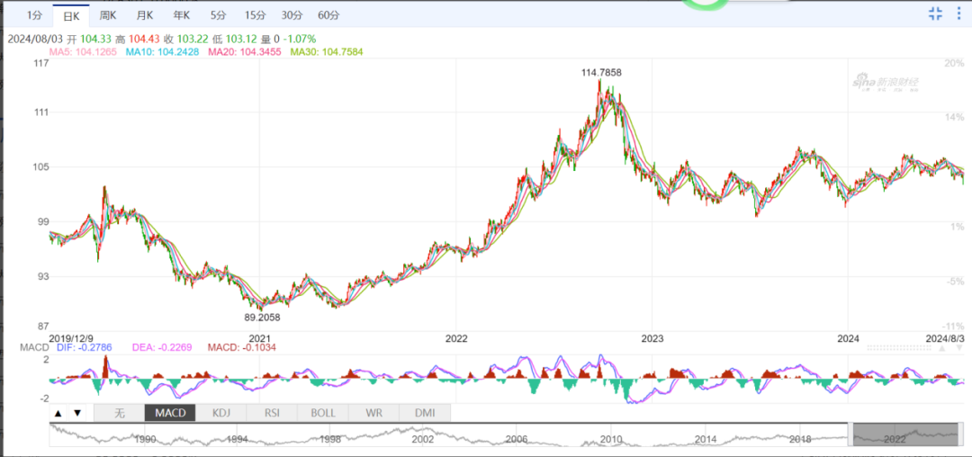首先看金融,2024年8月第一周人民币汇率大涨140个基点,尤其最后一个交易日一天就上涨了100多个基点,收盘时为7.1704。美元指数也是在上周最后一个交易日暴跌100多个基点,收盘时为103.1204。美国股市也是连续两天显著下跌,道琼斯工业平均指数从周三收盘时的40820.79,下跌到周五收盘时的39737.26。下跌了1083.53个点,合大约2.65%。