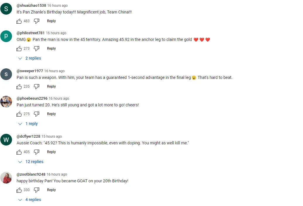 但也要把反华政客和普通人区别开来——并非所有人都会把体育问题政治化。更多人的只是在享受体育,祝福成功的运动员。这里,我们可以看看YouTube上NBC体育频道里网友对4x100混接决赛中国队夺冠的评论。可以看出来部分留言的是华人,也因为留言内容受到认可而被顶到最前。