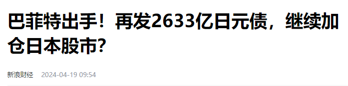 但是,巴菲特不是那么做的,他投资日本股市没有花美元,而是以自己的美元资产(持有的美股、房产等)为抵押从日本银行、企业或个人手中直接借来大量日元,然后投资日本股市的。举个简单的例子:我是中国人,我在中国有房产价值100万、持有的中国股票价值100万、车子100万,合计300万。这个时候,我跑到日本对日本银行、企业或个人说道,我在中国有价值300万的资产,我现在把这些资产都抵押给你们,从你们那借价值100万人民币的日元,每年给利息2%。由于日本的利率非常低,老百姓把钱存银行几乎没有什么利息,所以当他们看到我以300万人民币的资产抵押借价值100万人民币的日元的时候,就会抢着把钱借给我——存银行的利息为0,借给我有2%的利息,而且我有300万资产做抵押,没有任何风险。巴菲特就是这么玩的,自己没有掏一分钱就从日本借了大量日元。2019年,巴菲特控制的伯克希尔公司发行了首只日元债,共4300亿日元。接下来的几年,巴菲特又陆续八次发行日元债券。最近的一次是2024年4月,发行了2633亿日元债券。