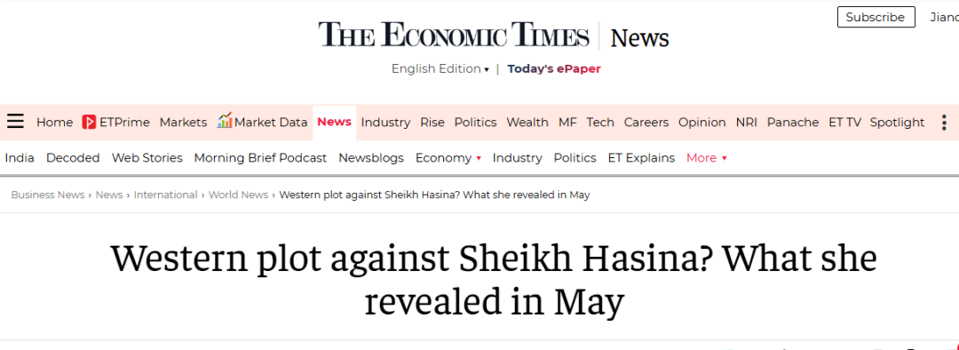 关于哈西娜的下台,印度国内阴谋论传的沸沸扬扬的,由于哈西娜常年亲印度,这也是哈西娜逃到印度的原因,印度非常不愿意看到哈西娜下台,看一个比较典型的印度媒体的说法:印度经济时报《西方阴谋反对谢赫·哈西娜?她在五月份透露了什么》