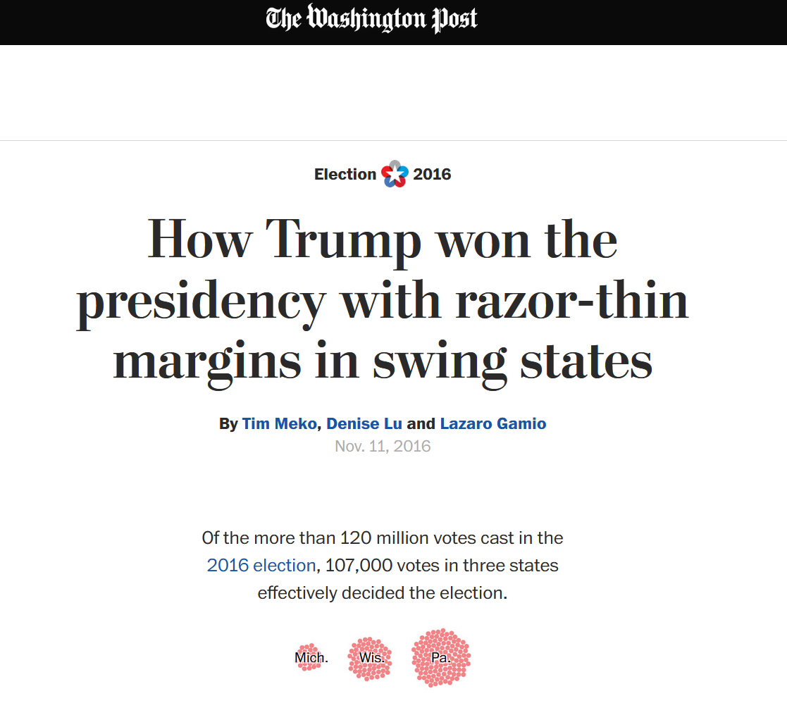华盛顿邮报在2016年11月的报道,标题为“特朗普如何以在摇摆州的微弱优势赢下总统大选”