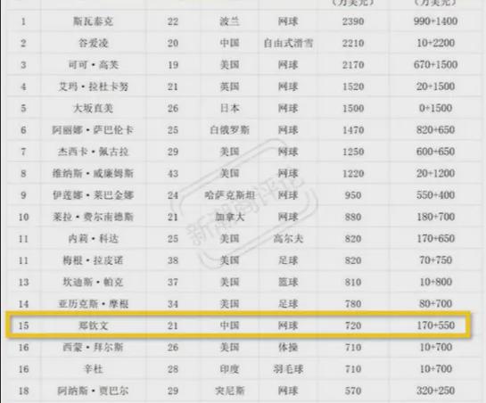 全世界的女运动员收入排行榜,前10名有9个是网球运动员(剩下1个是谷爱凌)