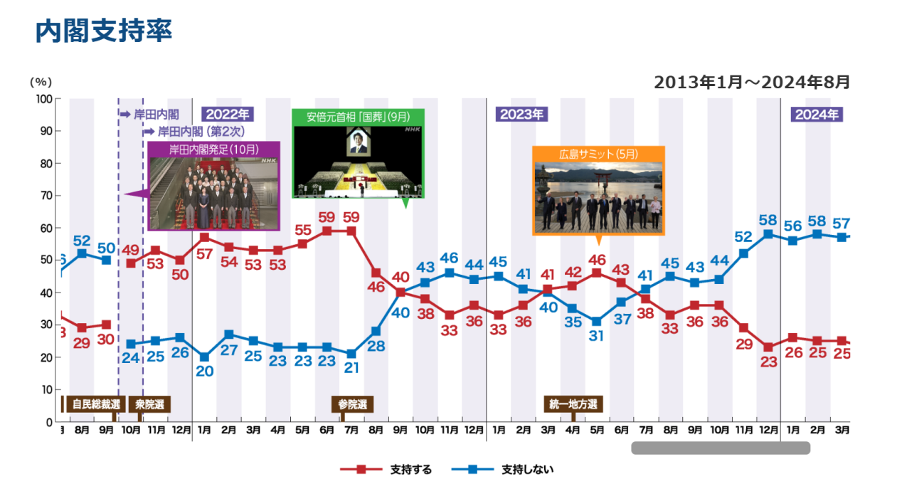 从历次日本国家电视台NHK所做的民意调查结果来看,岸田内阁的支持率从2021年10月一开始时的49%,一度上升到2022年7月的59%,此后基本一路下滑,到了2023年11月以后,一直处于30%以下,最低只剩23%。这样的内阁基本上就算是进入濒死阶段了,能坚持到现在8月,已是“难能可贵”。