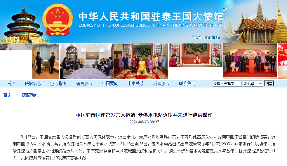 中国驻泰国使馆网站消息,8月27日,中国驻泰国大使馆新闻发言人向媒体表示,近日泰北、泰东北多地遭遇洪灾,中方对此高度关注。经向中国主管部门初步核实,近期中国境内河段水情正常,澜沧江相关水库处于蓄水状态。8月18日至25日,景洪水电站日均出库流量较往年8月减少60%,并未进行泄洪操作。澜沧江流域六国是山水相连的命运共同体,中方充分尊重和照顾流域国家的利益和关切,愿进一步加强水资源信息共享与合作,提升流域综合治理能力,共同应对气候变化和洪涝灾害等挑战。
