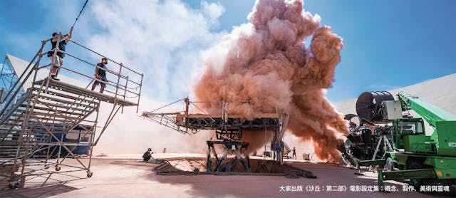 沙虫团队一整天的工作中,绝大多数都会伴随一次巨大的沙尘爆破,以模拟沙虫冲破沙丘。 「更大、更快、更好」,是拍摄现场天天都会出现的铭言。