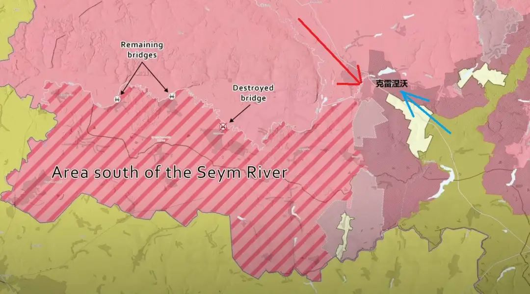 第一个方向是西部的克雷涅沃城。战前这里大约有6000人居住,没有永久性的坚固防御工事。乌军占领了城镇东边的大部分区域,逐步向城内推进。克雷涅沃不仅可以作为乌军继续前进的枢纽,而且它的西侧不远处,就是库尔斯克州内的一条大河谢伊姆河。