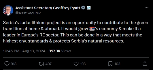 “塞尔维亚的亚达尔锂矿项目是促进塞国内外绿色转型的一个机会。它将促进塞尔维亚经济的发展,并使其成为欧洲可再生能源领域的领导者。”派亚特8月13日在社交媒体X(原推特)发帖说,“这可以通过满足最高环境标准和开发塞尔维亚自然资源的方式来实现。”