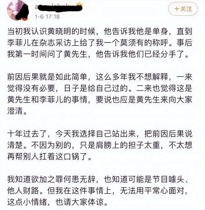 之后李菲儿参加《浪姐》,引起网友开始回忆她和Angelababy杨颖、黄晓明那段狗血故事,网友便骂Angelababy杨颖知三当三,明知黄晓明有正牌女友,还上赶着勾搭黄晓明。Angelababy杨颖随后发文,表示她认识黄晓明的时候,黄晓明向她承诺自己是单身,言下之意她是清白的,就算自己是三,也是被三,罪魁祸首是黄晓明。从这篇小作文就能看出来,Angelababy杨颖一点给黄晓明挽尊的意思都没有,疑似当时两人的婚姻就已经名存实亡了。