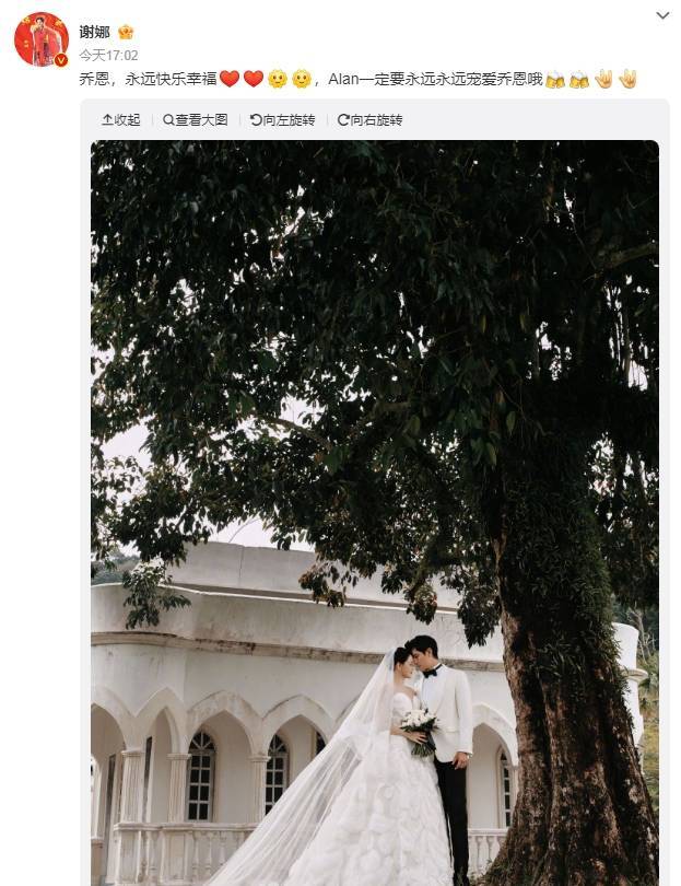 9月22日,谢娜在个人社交账号发文,为陈乔恩和Alan送上新婚祝福:Alan一定要永远永远宠爱乔恩哦。