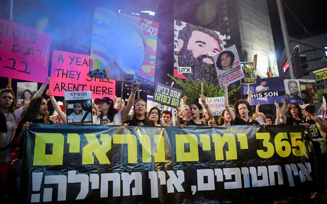 他们把愤怒的矛头指向内塔尼亚胡,指责他在冲突爆发后的一年内故意拖延人质协议。他们高举着标语横幅,上面写道——“抛弃了一年,此罪难赎!”