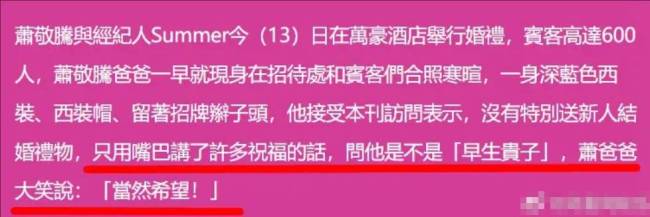 据台湾媒体报道,10月13日萧敬腾与经纪人林有慧举行盛大婚礼。在婚礼上萧敬腾父亲在台上发言:“谢谢你把你的女儿送给我家,非常感激你们”,接着他不忘催生,“要注意一点,你老爸也老了,你们要添丁,要有这个希望!”据悉,新娘林有慧Summer已经51岁。