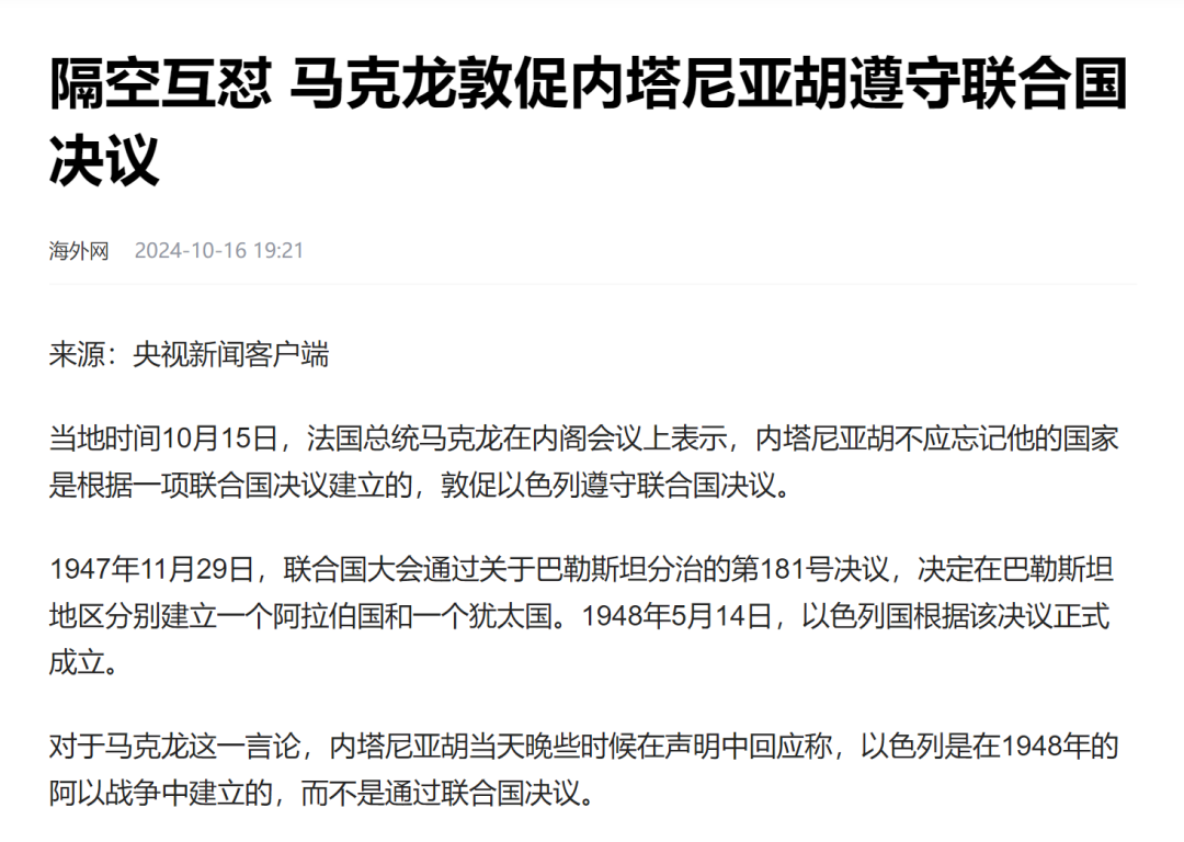 10月15日,法国总统马克龙在内阁会议上表示,内塔尼亚胡不应忘记他的国家是根据一项联合国决议建立的,敦促以色列遵守联合国决议。