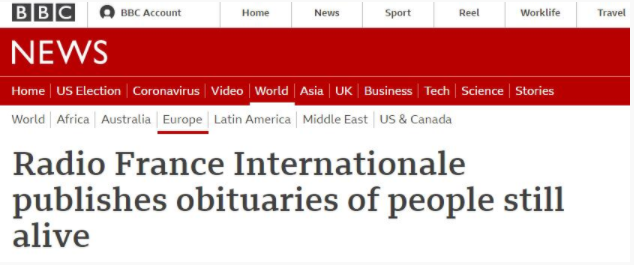 BBC说,除了英国女王以外,RFI还发布了喀麦隆共和国总统保罗•比亚和巴西足球运动员贝利以及美国前总统吉米•卡特等人的讣告。而这近百篇讣告不仅发布在RFI自家网站,还出现在谷歌、雅虎等合作平台。