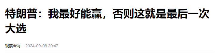 美国大选临近,无论是特朗普,还是哈里斯,没有谁占据绝对的优势,一切还存在变数。虽然特朗普的赢面很大,但也不排除有输的可能。这场大选对美国的意义非凡,它可能会决定美国未来整个国家的方向,所以无论是特朗普,还是哈里斯,以及他们所代表的利益集团,都异常的紧张。特朗普不止一次的说道:我最好能赢,否则这就是最后一次大选。2024年9月7日,特朗普在威斯康星州的竞选演说中对选民说了这么一段话:“如果我不能赢得大选,由卡玛拉·哈里斯执掌的美国庇护下的以色列就注定要灭亡。一年或者两年后,以色列将不复存在。我最好能赢,否则你们将会遇到从未遇到过的问题,我们可能将没有国家了,(所以)这可能是我们的最后一次大选。”