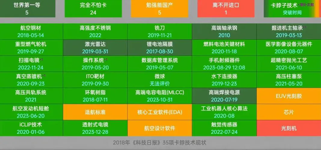 当然了,上面这些内容已经不重要了,只不过是让大家了解下基础数据,在脑中有一个大致的概念。我相信,更多的人关心的是:特朗普上台后会对世界做什么?会对中国有什么影响?特朗普上台后最重要的一件事自然是:对世界打贸易战。你别看特朗普是个“大嘴巴”,但是在他2016-2020年任期的行为告诉我们,他在重要的事情上,向来都是言出必行的——无论遇到多大的阻力。即使在他下台的4年时间内,他也不断声称,如果他再次执政要对中国加征幅度高达60%的关税,大有和中国打“第二回合”的架势,而对美国其他的贸易伙伴,也会征收10%到20%不等的关税。我估计,就算不加征60%的关税,也会加征10-20%以上的关税的。所以,毫无疑问,这会对中国出口美国商品的企业来说是一个重大利空——哪怕中国出口的商品在短期内难以替代,就算最终关税的代价由美国人承担了,中国企业也会遭受很大一部分损失,因为价格上涨会导致销量下降。虽然对中国企业有一定的伤害,但是总体可控,因为经过特朗普四年贸易战,再加拜登4年未取消关税,中国已经下降为美国的第二大贸易伙伴了。当然了,特朗普想要发展自己的制造业,不仅要对中国发动贸易战,也要对世界发动贸易战,否则中国商品既可以通过第三国出口到美国,也可以将一些利润比较低的产业直接转移到一些国家继续向美国出口。特朗普对其它国家打贸易战,其它国家自然也是要反制美国的,这样一来,中国就和世界联合起来——其它国家也会对美国商品加征关税,中国企业就有机会向其它国家增加出口,如此就可以抵消一部分的伤害。不过,说实话,我希望特朗普继续打科技战,否则我们的科技企业就会不思进取,总抱着幻想。在美国发动的科技战下,仅仅5年时间,工业皇冠上的明珠就陨落了29颗。比如,2018年的时候特朗普对中国汽车芯片发动了打压,结果导致了中国汽车芯片快速发展:2021年,汽车芯片国产占有率不到1%,欧美芯片占据着99%以上的中国汽车芯片市场。但是,到了2023年,汽车芯片国产占有率达到了50%。目前,国产汽车芯片已经完全抹平了和美欧企业的代差,据行业预测,2024年,汽车芯片国产占有率将达到80%-90%。下面图中深绿的就是我们处于世界第一的,绿色是完全不怕卡的,黄色是勉强能国产的,红色是被卡的。再有4年,我估计我们就能拿下工业皇冠上所有的“明珠”了。