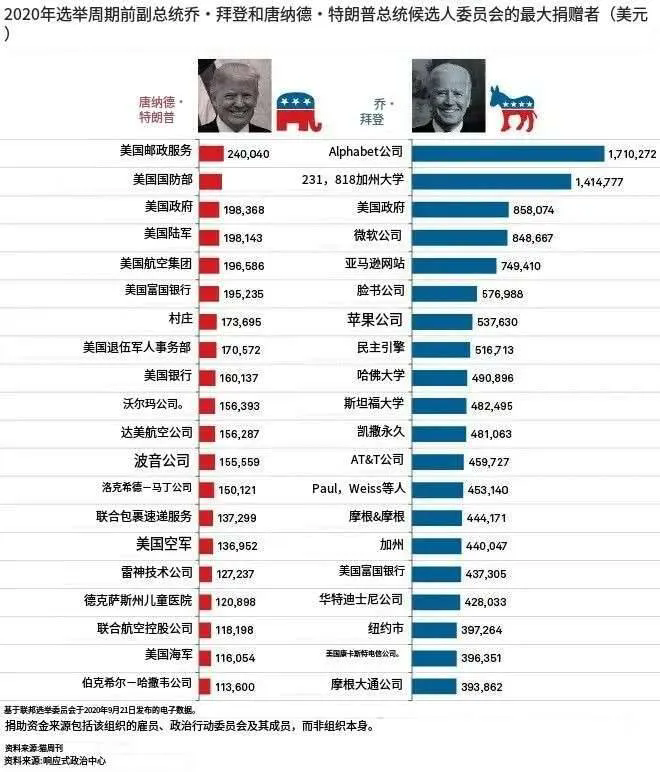 特朗普这个人有很多的毛病,但有一点是我欣赏的,他不喜欢战争。他是商人,没有钱赚的事情他不会做,而打仗是要花很多钱的,所以他不太喜欢打仗。虽然特朗普不喜欢打仗,但是他却是想要赚中东国家的钱的。特朗普的背后有两个非常重要的利益集团:石油集团和军工集团。中东乱起来,石油价格就会上涨,这符合美国石油利益集团的利益,所以特朗普上台后一定是要搞乱中东的。大家看下面一个图:2020年的时候,特朗普最大捐赠者的里面有很多军方的代表,包括美国国防部、美国陆军、美国航空集团、美国空军、美国海军和很多军工企业。