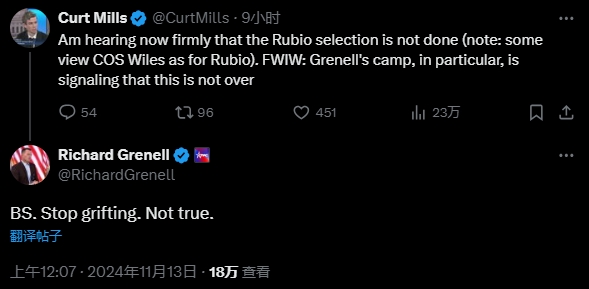 Politico提到,尽管各大新闻媒体均报道称,特朗普已决定任命卢比奥为下一任国务卿,但卢比奥潜在竞争者里克·格雷内尔(Ric Grenell)的支持者12日坚称,此事尚未尘埃落定。