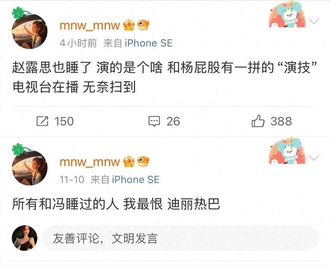 除了杨紫以外,圈内很多女明星在她小作文里,都成了靠着睡而上位的人,她还专门挑当红女明星,赵露思、迪丽热巴等都遭受过她的污蔑,还特别说在勾引她男朋友的女艺人中,最讨厌迪丽热巴了,可以说是无差别攻击了,因此不少人怀疑,这个网友应该是在精神方面有什么问题,所以才乱咬人。