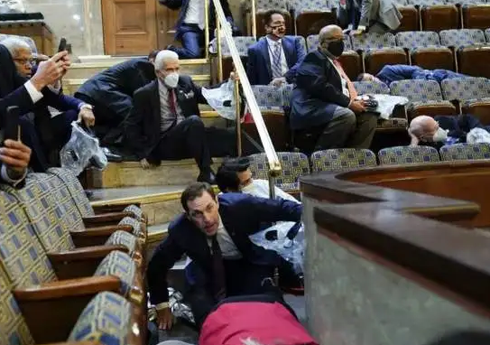 随着聚集的红脖子越来越多,他们干脆一鼓作气攻入国会,在黑压压的人群面前,国会警卫根本不是对手,很快就被缴械。当时里面的议员正在开会,得知外面的抗议群众攻破大门,有些瞬间吓得瘫软在地,现场一片狼藉。