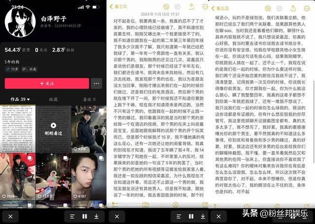 紧随其后“梁嘉蕊”的前男友“百泽野子”也出来发文爆料,发布长文讲述了与女主分手的原因,并且爆料了把两男友安排在同一家酒店?
