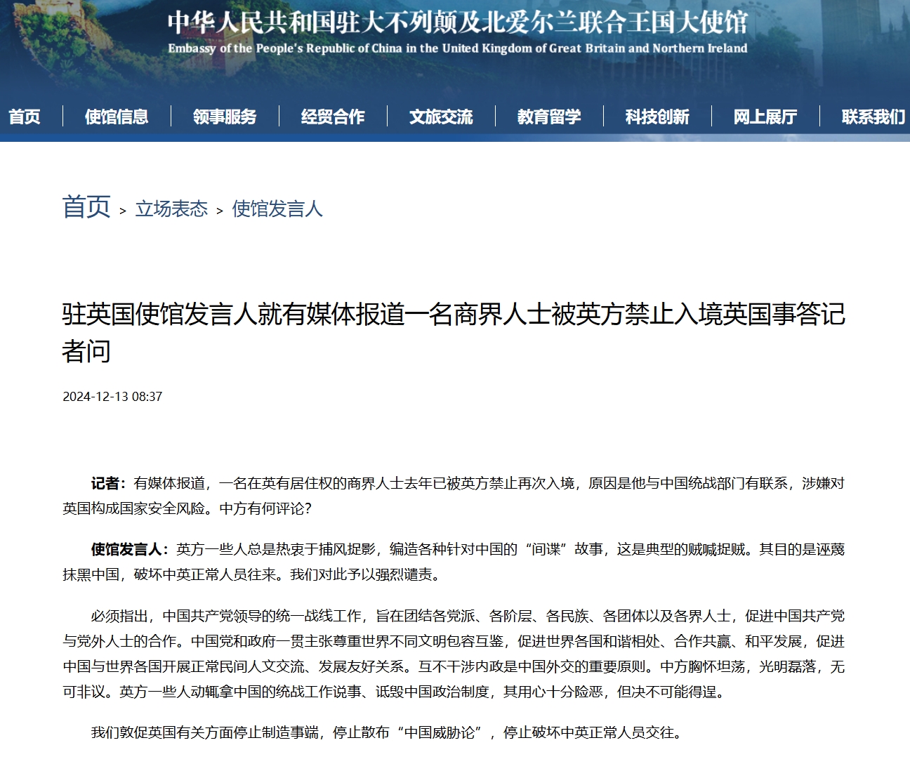中国驻英大使馆网站12月13日消息,驻英国使馆发言人就有媒体报道一名商界人士被英方禁止入境英国事答记者问。