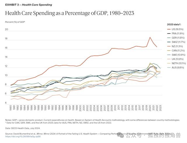 独立研究机构英联邦基金会(The Commonwealth Fund)2024年9月19日发表一份报告,分析了澳洲、加拿大、法国、德国、荷兰、新西兰、瑞典、瑞士、英国和美国等10个发达国家的医疗表现。报告显示,与其他9个主要发达国家相比,美国在医疗保健方面的支出占比GDP最高,达到其GDP的16.5%。